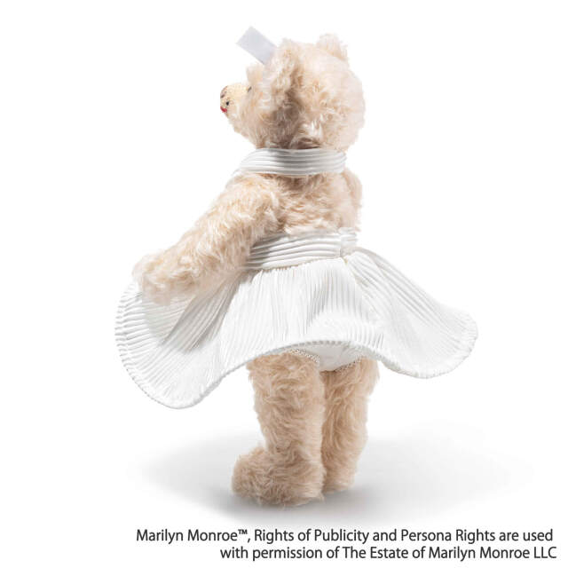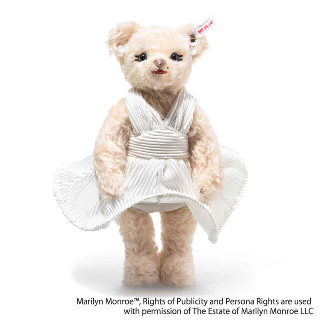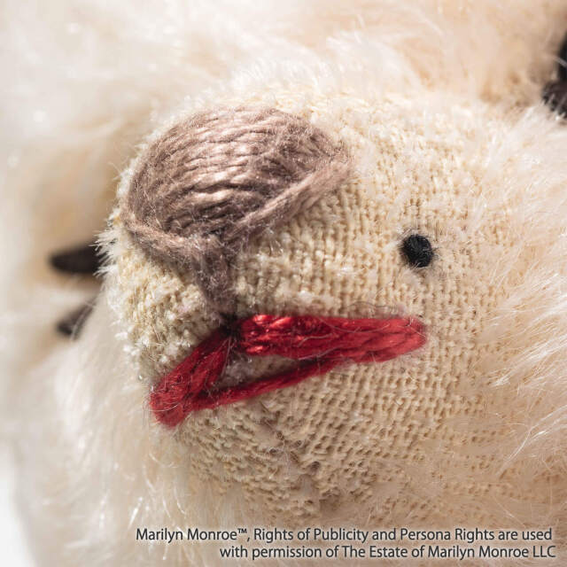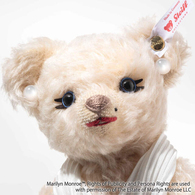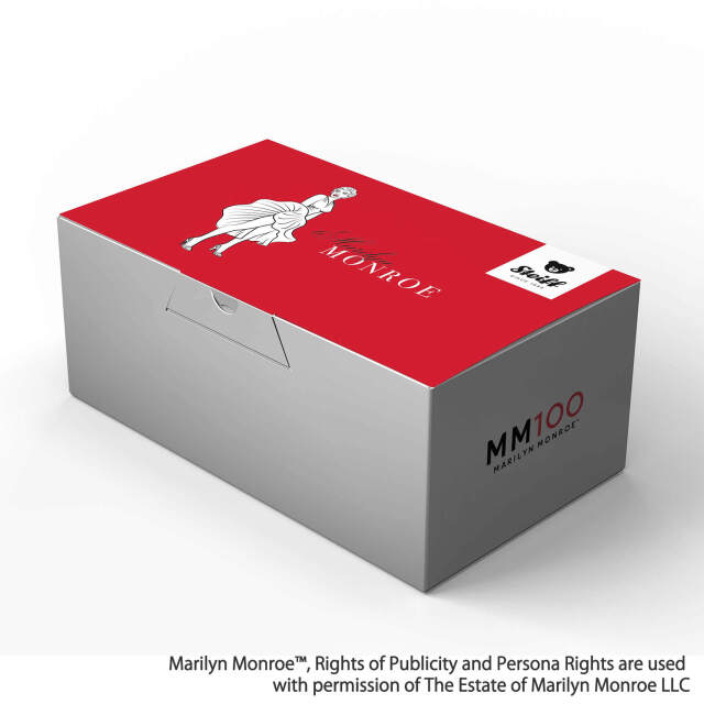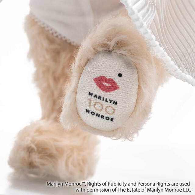 1926年生まれのマリリン・モンローは、映画史に残る永遠の銀幕スター的存在です。誕生100周年を記念し、シュタイフは映画『七年目の浮気』の名シーンに着想を得たテディベアを制作しました。アイボリーカラーのカクテルドレスに、パールのイヤリング、印象的なアイライン、赤いリップ、そして象徴的なビューティースポット(左頬のほくろ)など、細部に至るまでマリリンの魅力を忠実に再現しています。サテンで覆われた足裏には、アニバーサリー・ロゴがあしらわれています。時代を超えた輝きは、今なお世界中の人々を魅了し続けています。