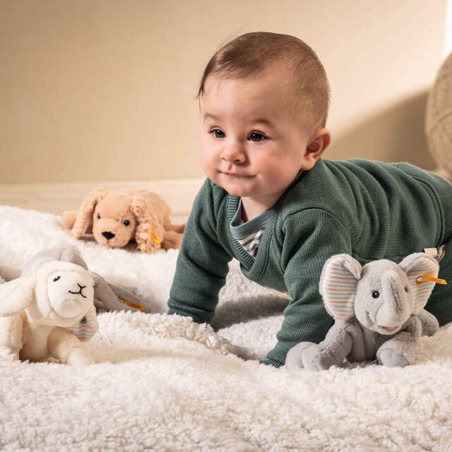 握って遊べるくたくたボディが楽しいフロッピーシリーズ。ちっちゃく笑った口元がかわいらしく、目は白いワンポイントの入った刺繍で仕上げられています。おなかにペレット(小さな粒の重し)が入っているのでぎゅっと握って遊べます。